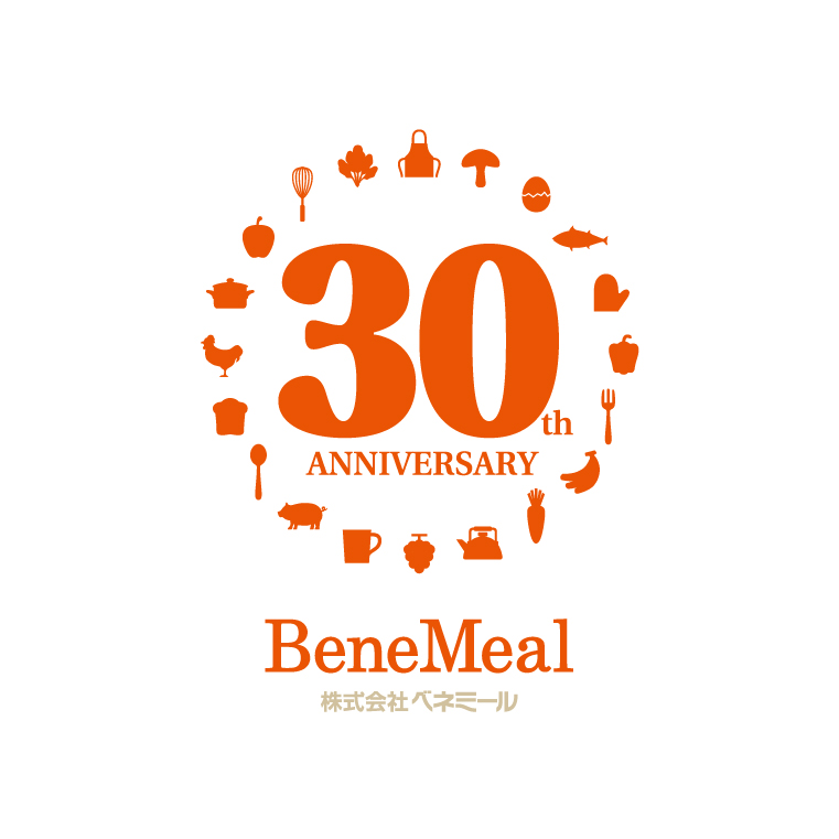 イタリア語の大変良いという意味のbeneと英語の食事mealを組み合わせた造語を社名としました。「食」のテーマに相応しいオレンジをコーポレート・カラーに選び、落ち着きのあるローマン体でBeneMealの信頼感を伝えています。周年記念ロゴのデザインは「食」にかかわる20の要素が ANNIVERSARYの文字を囲み、ベネミール20年の事業活動を象徴しています。
